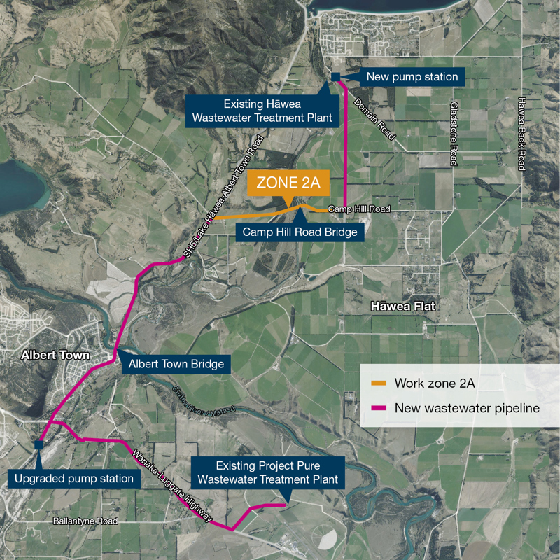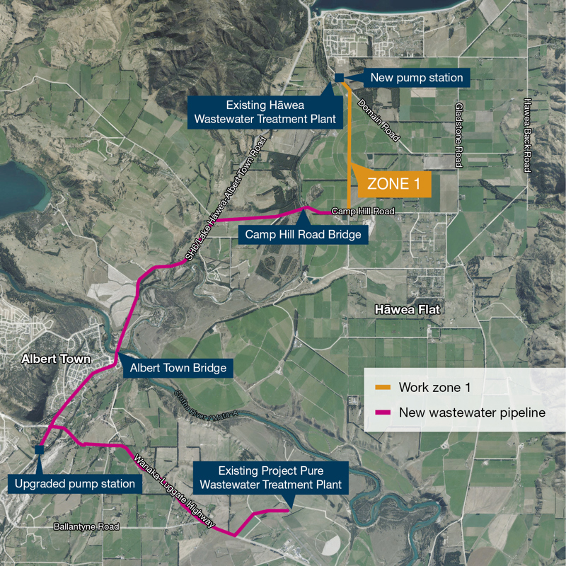 • From the existing Hāwea Wastewater Treatment Plant, south to Camp Hill Road.