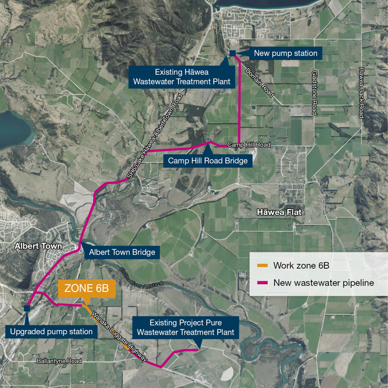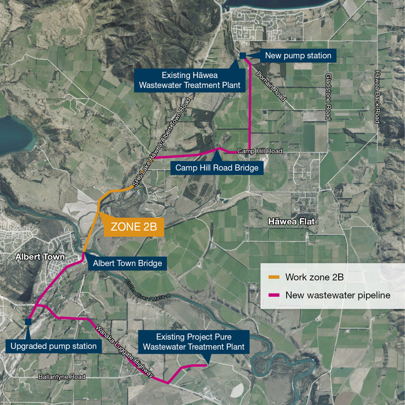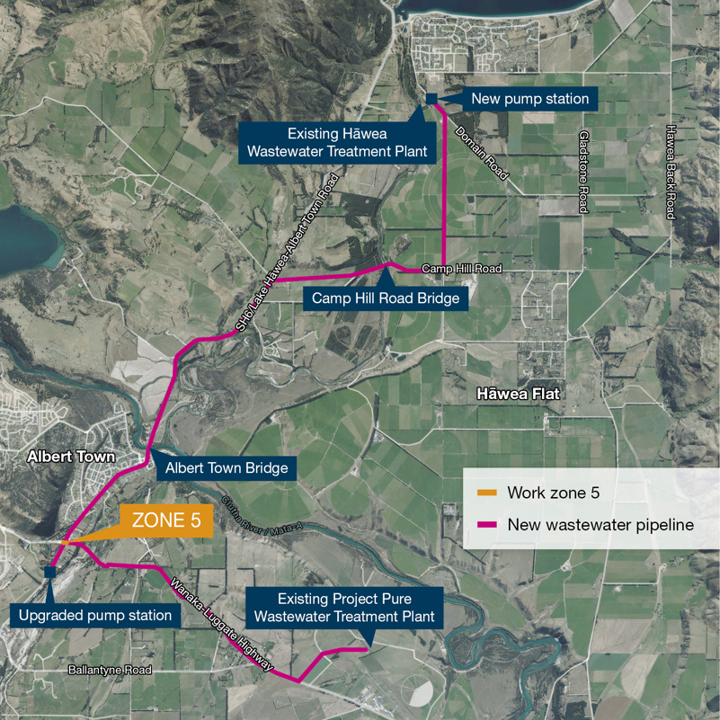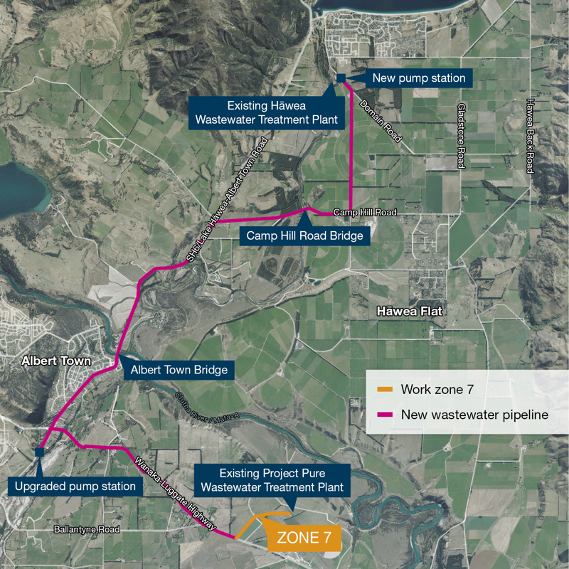 • We’ve been engaging with NZTA Waka Kotahi throughout the design process for these wastewater upgrades and can confirm the new pipeline will be attached to Albert Town Bridge. We have taken steps during design to ensure that in the event the bridge is replaced, the wastewater pipe can be realigned and attached to the new bridge.